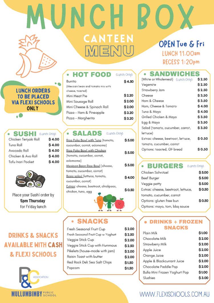 The school Canteen is open on Tuesdays and Fridays at Lunch and Recess.