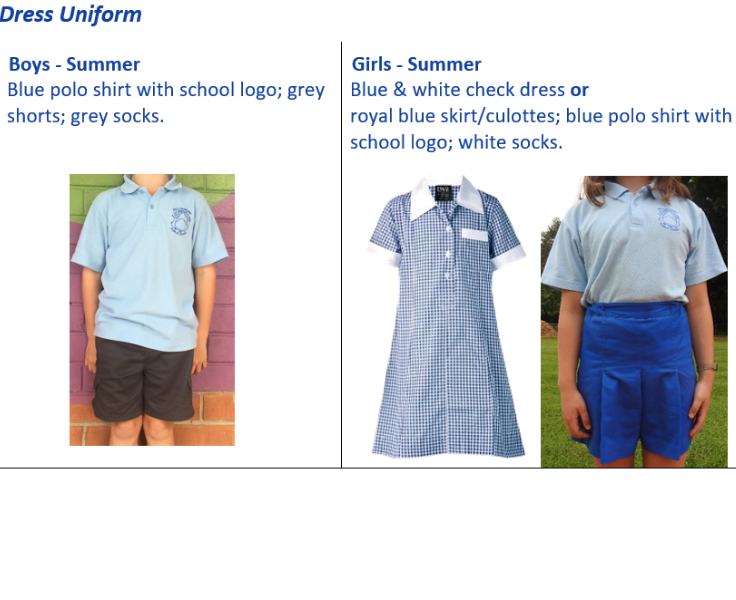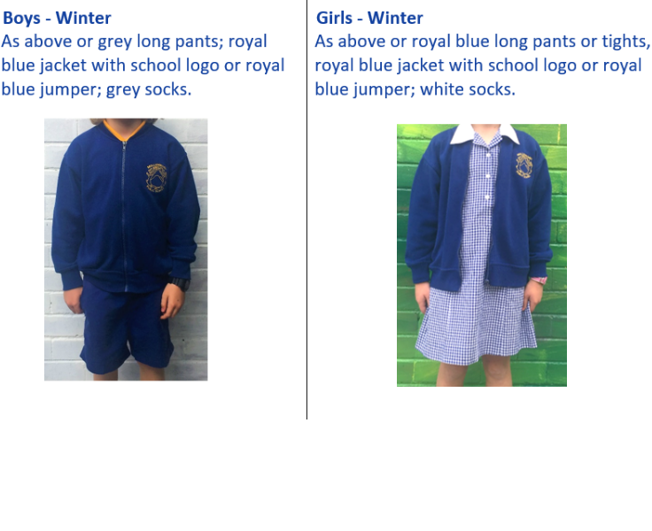 We encourage students to wear the school uniform, although alternatives from other shops in the appropriate colour are acceptable. All pants, leggings and tights must be in royal blue (for girls) and grey (for boys), NOT black.